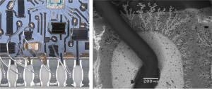 Corrosion of silver conduction lines on a hybrid PCBA exposed to pig farm conditions with H2S: (A) overview of corroded silver lines (black layer on silver is due to corrosion) and (B) formation silver sulfide dendrite due to the movement of corrosion products at the edge of the conduction paths.